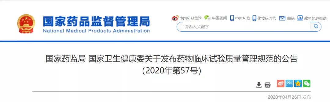 4月26日,国家药监局 国家卫生健康委联合发布公告,药物临床试验质量管理规范,自2020年7月1日起施行。