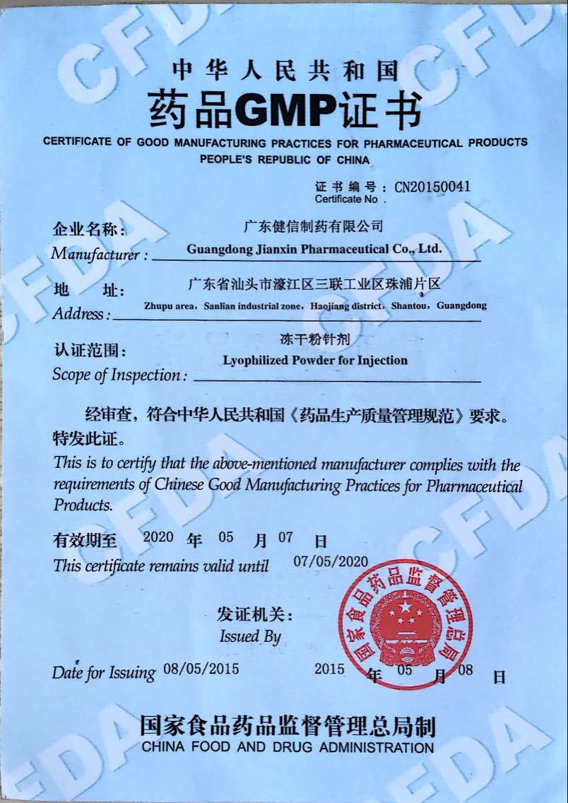 广东健信制药于2014年12月顺利通过GMP认证,2015年5月份取得GMP证书。